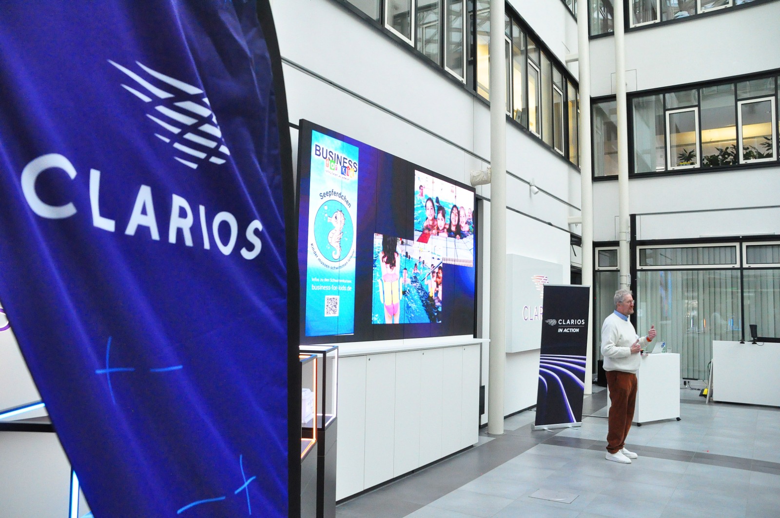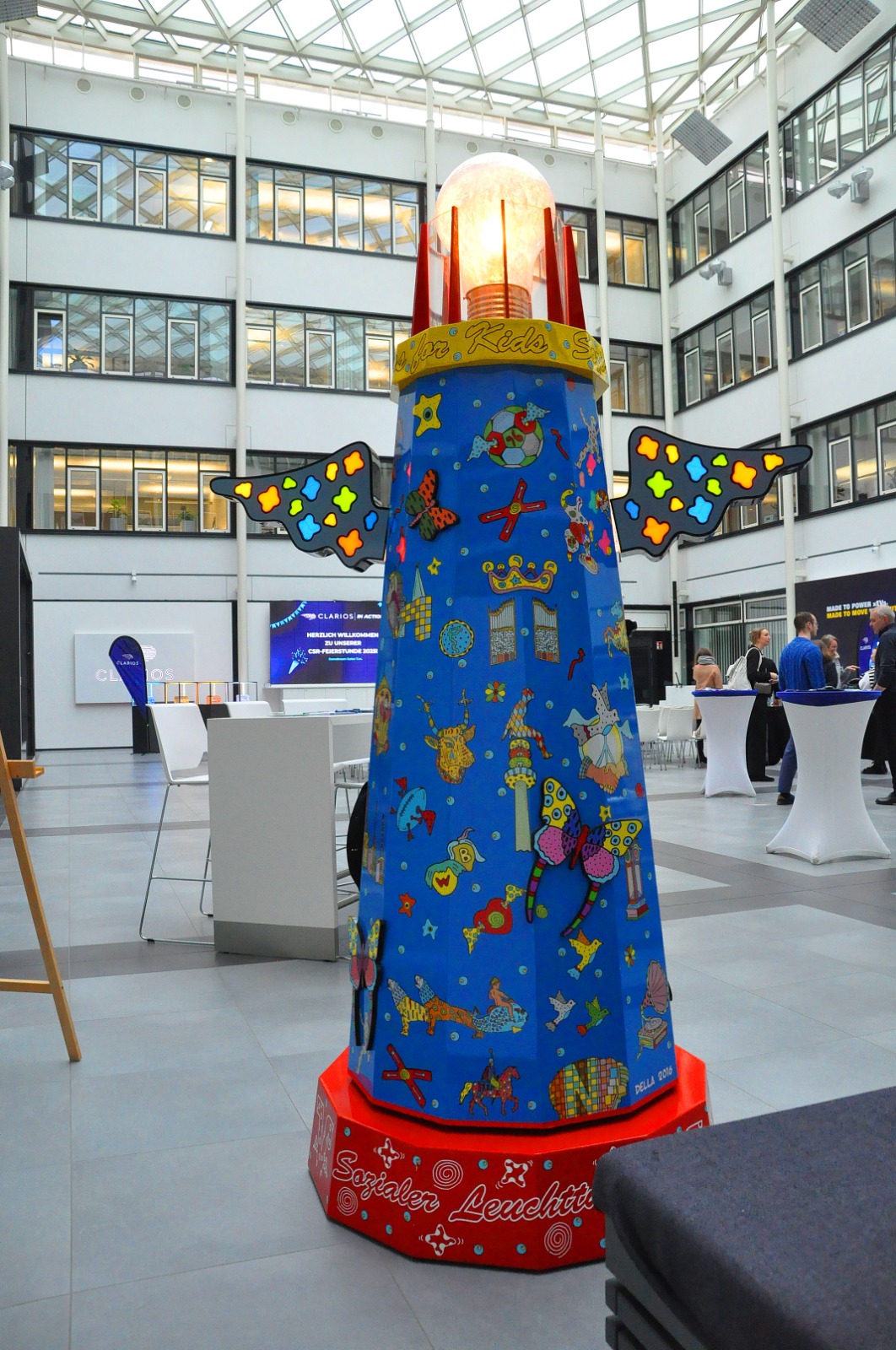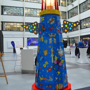 Soziales Engagement wird beim hannoverschen Batteriehersteller Clarios Varta seit vielen Jahren groß geschrieben. Groß war daher auch die Freude beim Business for Kids-Vorsitzenden Joachim Wehrmann, als das innovative und weltweit aktive Stöckener Unternehmen im Herbst ankündigte, im Rahmen seines umfangreichen sozialen Einsatzes für die Menschen der Region die Arbeit von Business for Kids mit einer Spende in Höhe von 12.500 Euro zu unterstützen. Im Rahmen einer Feierstunde in der hannoverschen Unternehmenszentrale, Am Leineufer 51, überreichte nun Barbora Kasanicka, die Geschäftsführerin und Leiterin Personalwesen EMEA, am 24. November den entsprechenden Scheck dazu. Joachim Wehrmann dankte Clarios Varta sehr für die wohl dem Bereich Kinder-Schwimmlernprojekt zugutekommende Spende. Der BfK-Vorsitzende überreichte als kleinen Dank nicht nur zwei der beliebten kleinen Vereins-Stoffbären, sondern hatte zuvor im Lichthof der Firmenzentrale den seit 2012 in ausgesuchten Unternehmen auf Zeit verliehenen, rund 2,5 Meter hohen sozialen Leuchtturm des Fördervereins aufgebaut. Dieser war einst vom hannoverschen Künstler Della gestaltet worden und ist ein Projekt, das Menschen in Not unterstützt, Integration fördert und soziale Teilhabe ermöglicht. Aktuell leuchtet er nun beispielhaft für andere bis Januar 2026 bei Clarios Varta, in Stöcken.