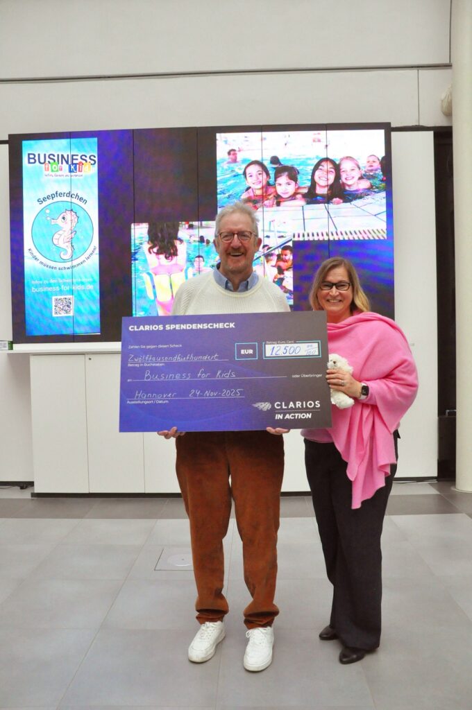 im Rahmen seines umfangreichen sozialen Einsatzes für die Menschen der Region die Arbeit von Business for Kids mit einer Spende in Höhe von 12.500 Euro zu unterstützen. Im Rahmen einer Feierstunde in der hannoverschen Unternehmenszentrale, Am Leineufer 51, überreichte nun Barbora Kasanicka, die Geschäftsführerin und Leiterin Personalwesen EMEA, am 24. November den entsprechenden Scheck dazu. Joachim Wehrmann dankte Clarios Varta sehr für die wohl dem Bereich Kinder-Schwimmlernprojekt zugutekommende Spende. Der BfK-Vorsitzende überreichte als kleinen Dank nicht nur zwei der beliebten kleinen Vereins-Stoffbären, sondern hatte zuvor im Lichthof der Firmenzentrale den seit 2012 in ausgesuchten Unternehmen auf Zeit verliehenen, rund vier Meter hohen sozialen Leuchtturm des Fördervereins aufgebaut. Dieser war einst vom hannoverschen Künstler Della gestaltet worden und ist ein Projekt, das Menschen in Not unterstützt, Integration fördert und soziale Teilhabe ermöglicht. Aktuell leuchtet er nun beispielhaft für andere bis Januar 2026 bei Clarios Varta, in Stöcken.