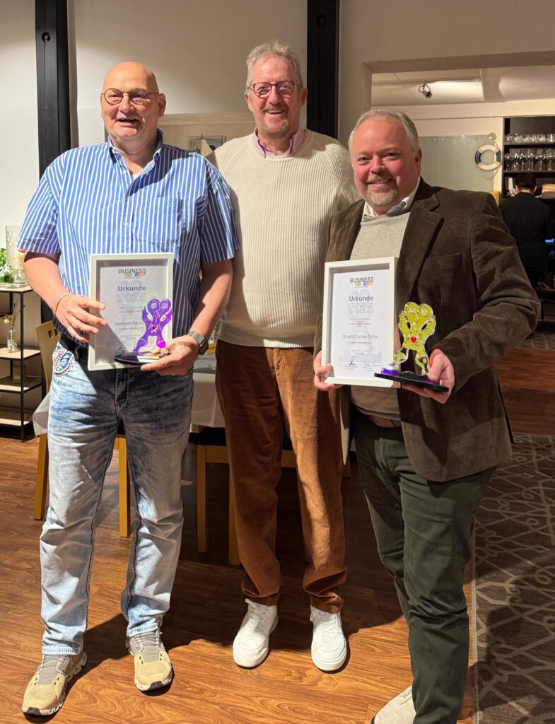 Große Freude am 27. März 2025 beim Business for Kids-Vorsitzenden Joachim Wehrmann und seinem Stellvertreter Andreas Bausch: Im Rahmen des Abendevents beim BNI19-Netzwerktreffen, im Businessbereich der Heinz-von Heiden-Arena, übereichte Umweltdruckhaus Hannover-Geschäftsführer Thomas Rätzke den beiden einen Spendenscheck in Höhe von 1.000 Euro zugunsten der Projekte von Business for Kids. Joachim Wehrmann betonte das Engagement im Bereich der mit Spenden wie diesen finanzierten Schwimmkurse. Bisher haben schon 1.771 Kinder durch Business for Kids so ihr Seepferdchen- und Bronzeabzeichen erlangt. Als Dankeschön und Anerkennung der Hilfe erhielt Thomas Rätzke dafür zwei kleine Stoffbären des Vereins als Geschenk.