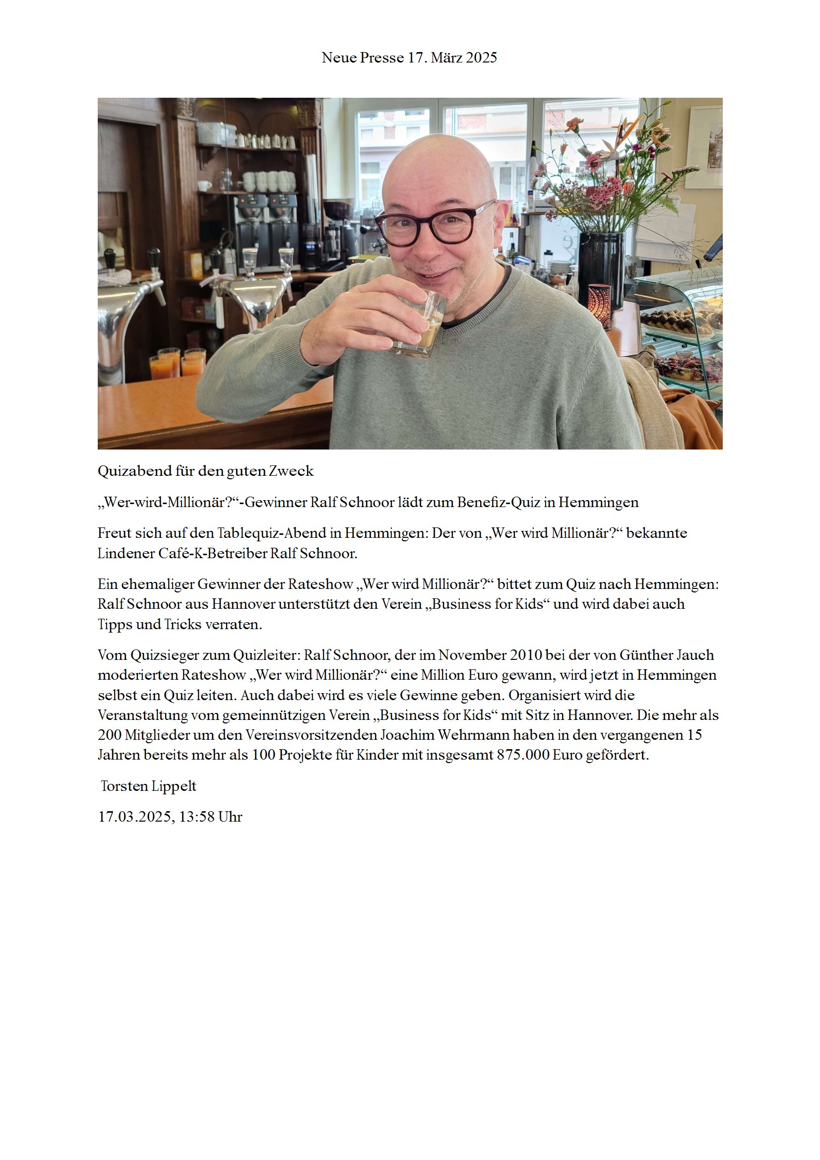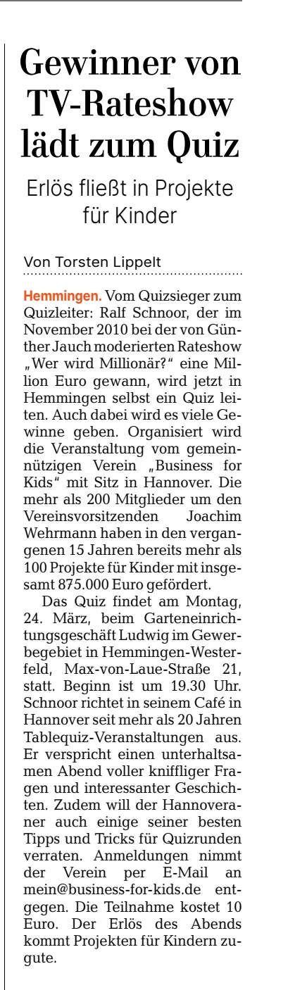 TL: Bei Gartenmöbel Ludwig fällt mir ein: Das Interessante ist, dass man teilweise nicht weiß, ob nicht bei einer Veranstaltung, die relativ wenig Geld über die Spendensammlung selbst einbringt, trotzdem Multiplikatoreffekte eintreten. Weil halt viele Leute dabei sind und das Projekt so überhaupt erst kennenlernen. Bei Gartenmöbel Ludwig haben wir im Anschluss an unsere aktuelle Mitgliederversammlung mit Ralf Schnoor, dem „Wer wird Millionär“-Gewinner, der in Linden das Café K leitet, ein Table Quiz veranstaltet. Er hatte sich freundlicherweise bereit erklärt, dies ehrenamtlich für den Verein zu machen – und hat auch seine leckeren Pralinen zur Verfügung gestellt. Da waren dann über 90 Gäste, die mitgerätselt haben und so auch an das